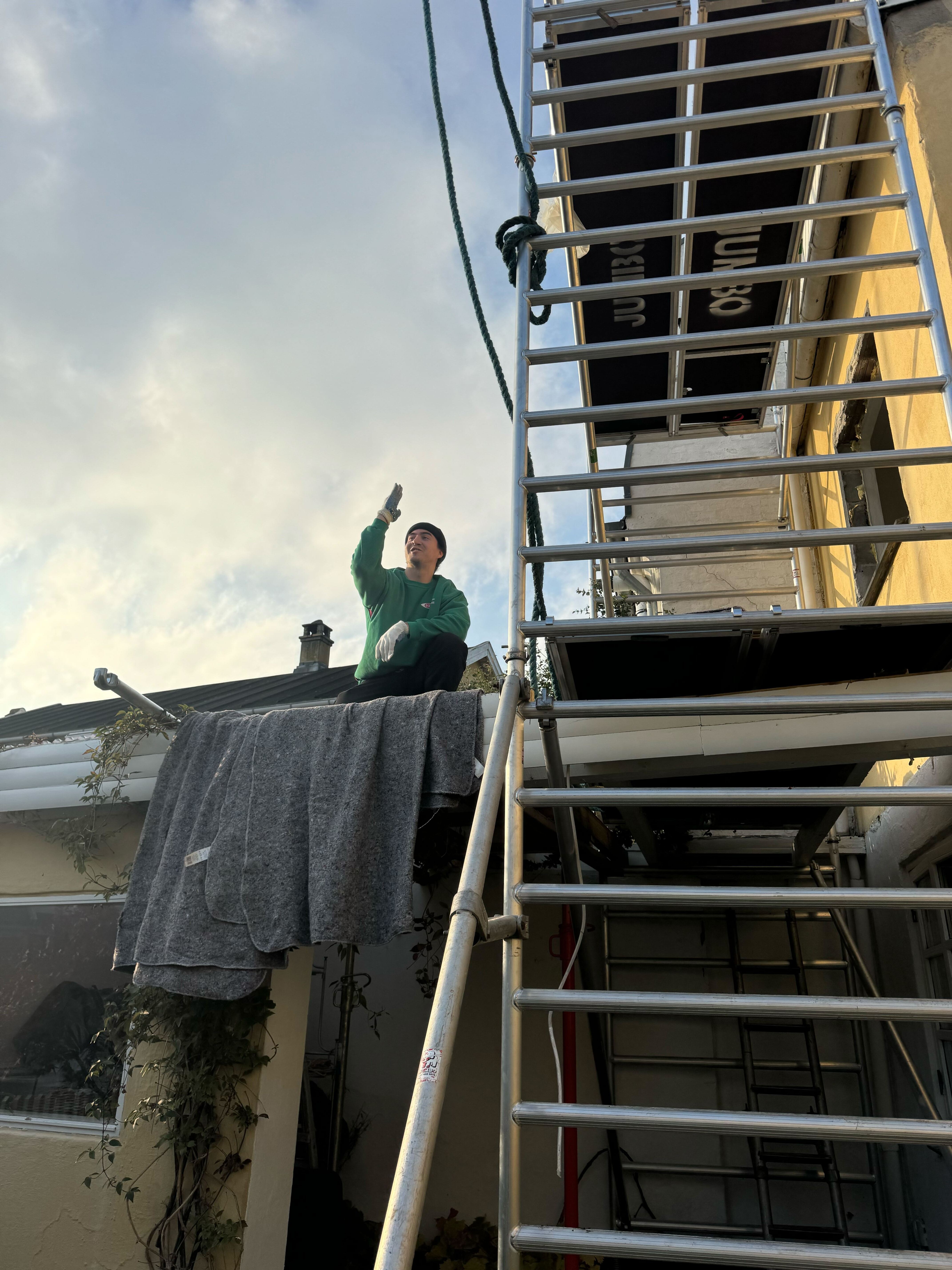 La solución fue elevarlo por la ventana con un andamio. Tras una rápida planificación con fotos y medidas, nos presentamos cuatro personas, cumplimos el plazo estimado de 2,5 horas y sacamos e introdujimos ambos aparatos de forma segura.