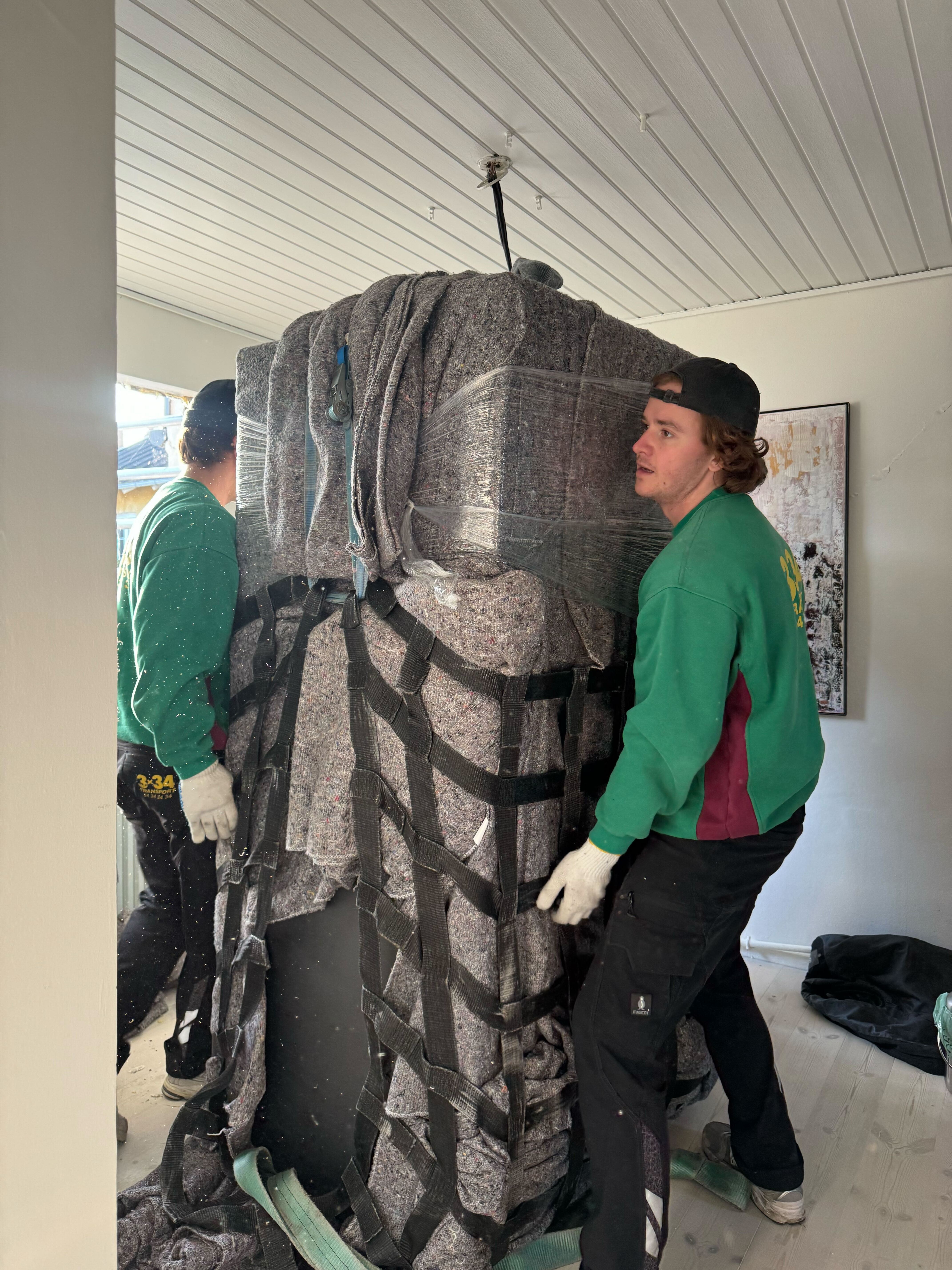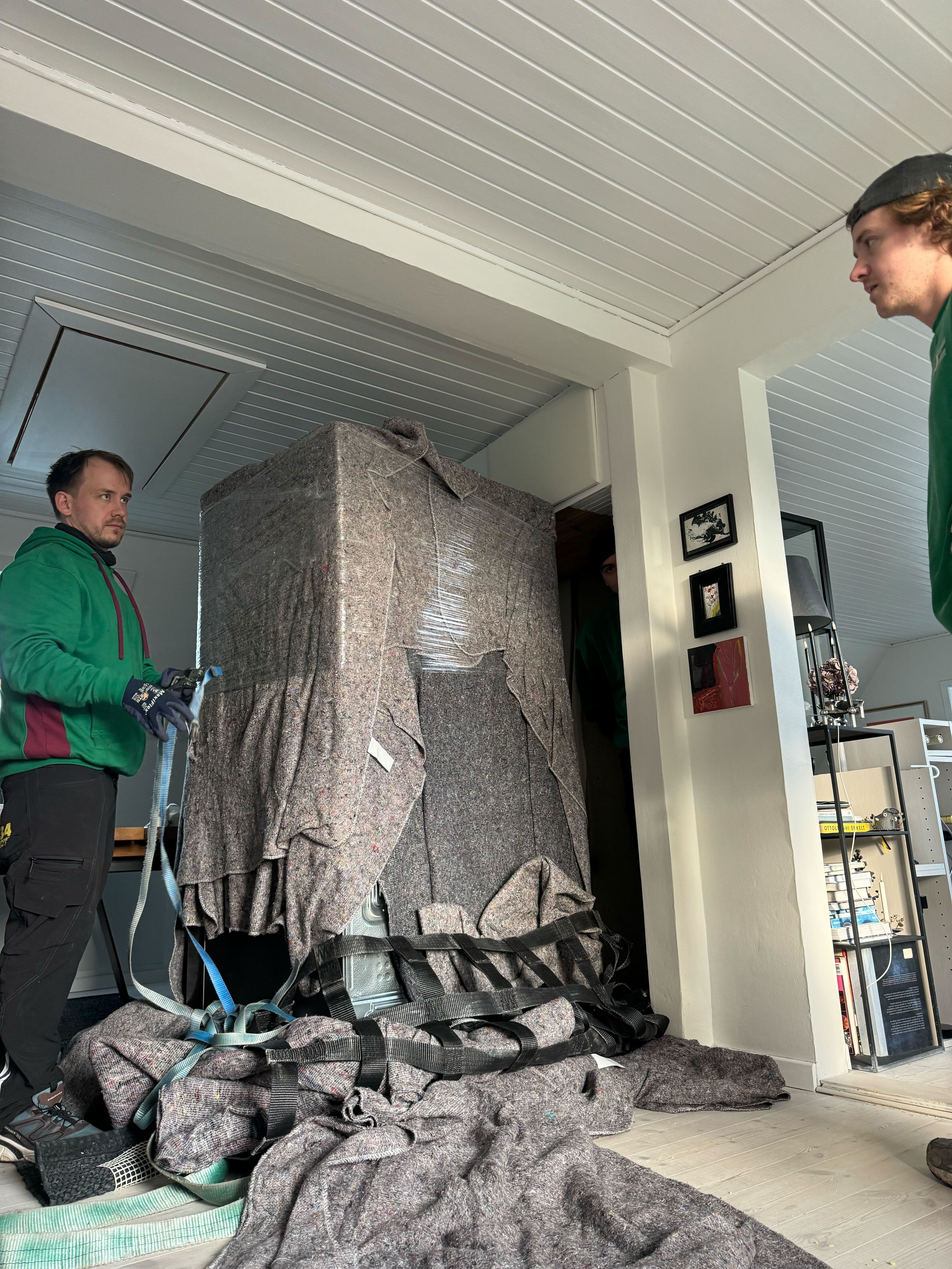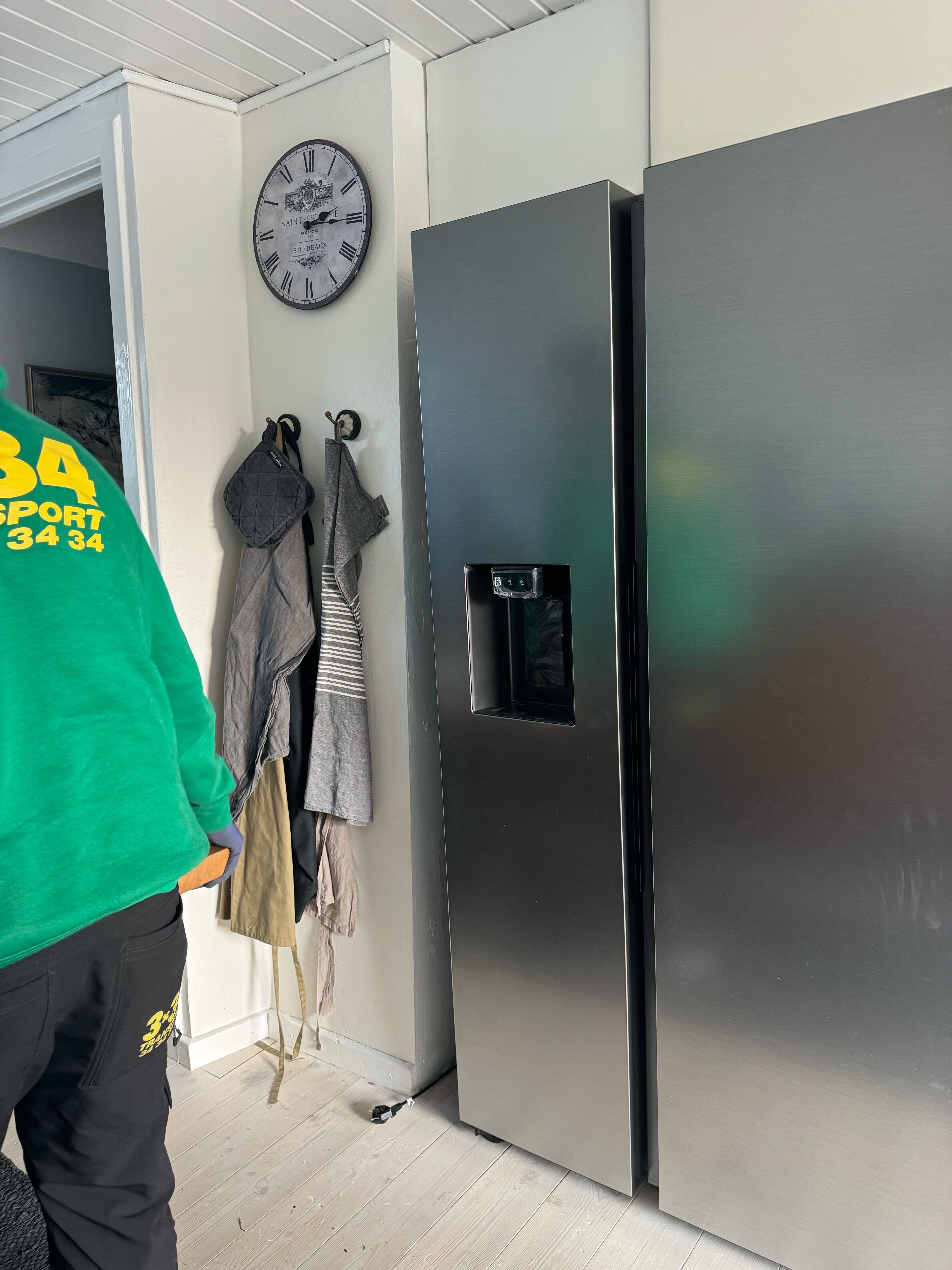 Después de que varias empresas de mudanzas intentaran sacar nuestro viejo frigorífico americano y meter el nuevo en nuestra pequeña casa de Skovser, 3×34 Minding se encargó de la tarea y la resolvió de forma increíblemente eficaz y elegante. 💪🏼